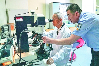 圖為崔道植(左)在進行痕跡檢驗工作。新華社發