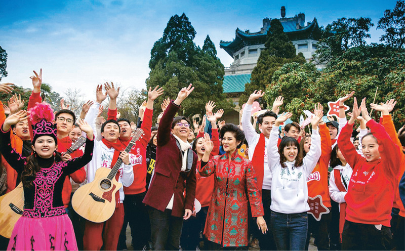 2018年歲末,千余名武漢大學(xué)師生登上櫻園老齋舍,用快閃唱響《我和我的祖國》,表達當代年輕學(xué)子的愛國之情。 武漢大學(xué) 王志敏/攝