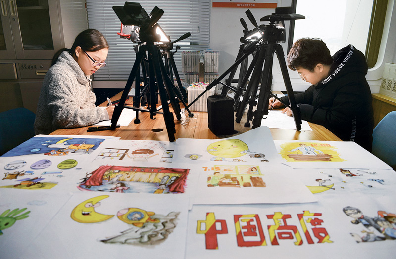 傳播主流價值,開展思想政治教育,受到學(xué)生歡迎。圖為“一分鐘”微視頻團隊的學(xué)生在繪制簡筆漫畫。 新華社記者 馬寧/攝