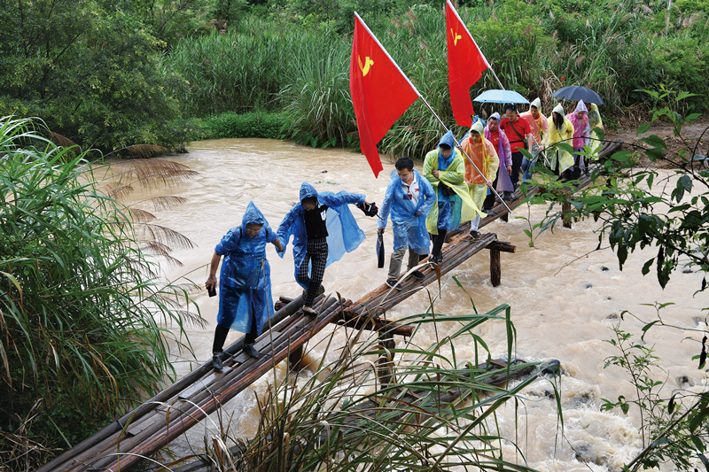 2019年6月11日至8月18日,中央宣傳部組織開展了“壯麗70年·奮斗新時代——記者再走長征路”主題采訪活動,先后有1300余名記者追隨當年紅軍長征步伐,深入實地采訪,累計跨越16000余公里,推出10000余篇鮮活生動、形式多樣的報道,網上總閱讀量近20億次。習近平總書記近日對“記者再走長征路”主題采訪活動作出重要指示強調,中央宣傳部組織開展的“記者再走長征路”主題采訪活動,生動再現壯懷激烈、驚天動地的革命故事,對闡釋用生命和鮮血鑄就的偉大長征精神很有意義。圖為6月13日,參加主題采訪活動的記者們,在江西于都縣祁祿山沿著當年中央紅軍長征走過的“紅軍小道”冒雨行進,體驗紅軍穿越深山峽谷的艱苦行程。 經濟日報記者 劉興/攝