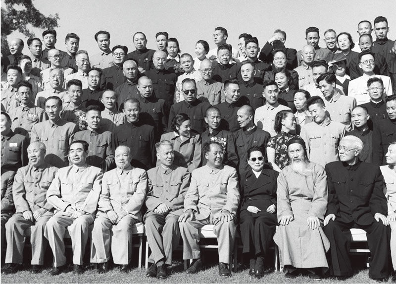 中華人民共和國第一屆全國人民代表大會第一次會議全體代表于1954年9月21日合影。 毛澤東主席和代表們在一起。前排左起:董必武、周恩來、李濟深、劉少奇、毛澤東、宋慶齡、張瀾、林伯渠。 新華社稿 侯波/攝
