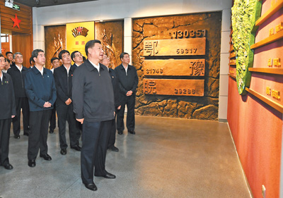 大別山區的信陽市新縣,是鄂豫皖蘇區首府所在地。16日下午,習近平首先來到鄂豫皖蘇區首府烈士陵園,瞻仰革命烈士紀念碑、紀念堂,遠眺英雄山上“紅旗飄飄”主題雕塑。在紀念碑前,習近平向革命先烈敬獻花籃并三鞠躬,深情緬懷為革命勝利獻出寶貴生命的英雄兒女。在紀念堂內,習近平聽取革命烈士事跡介紹,高度評價他們的貢獻。他強調,這次考察第一站就是鄂豫皖蘇區首府烈士陵園,目的是在慶祝新中國成立70周年之際,緬懷革命先烈,告慰革命英靈。我每次到革命老區考察調研,都去瞻仰革命歷史紀念場所,就是要告誡全黨同志不能忘記紅色政權是怎么來的、新中國是怎么來的、今天的幸福生活是怎么來的,就是要宣示中國共產黨將始終高舉紅色的旗幟,堅定走中國特色社會主義道路,把先輩們開創的事業不斷推向前進。