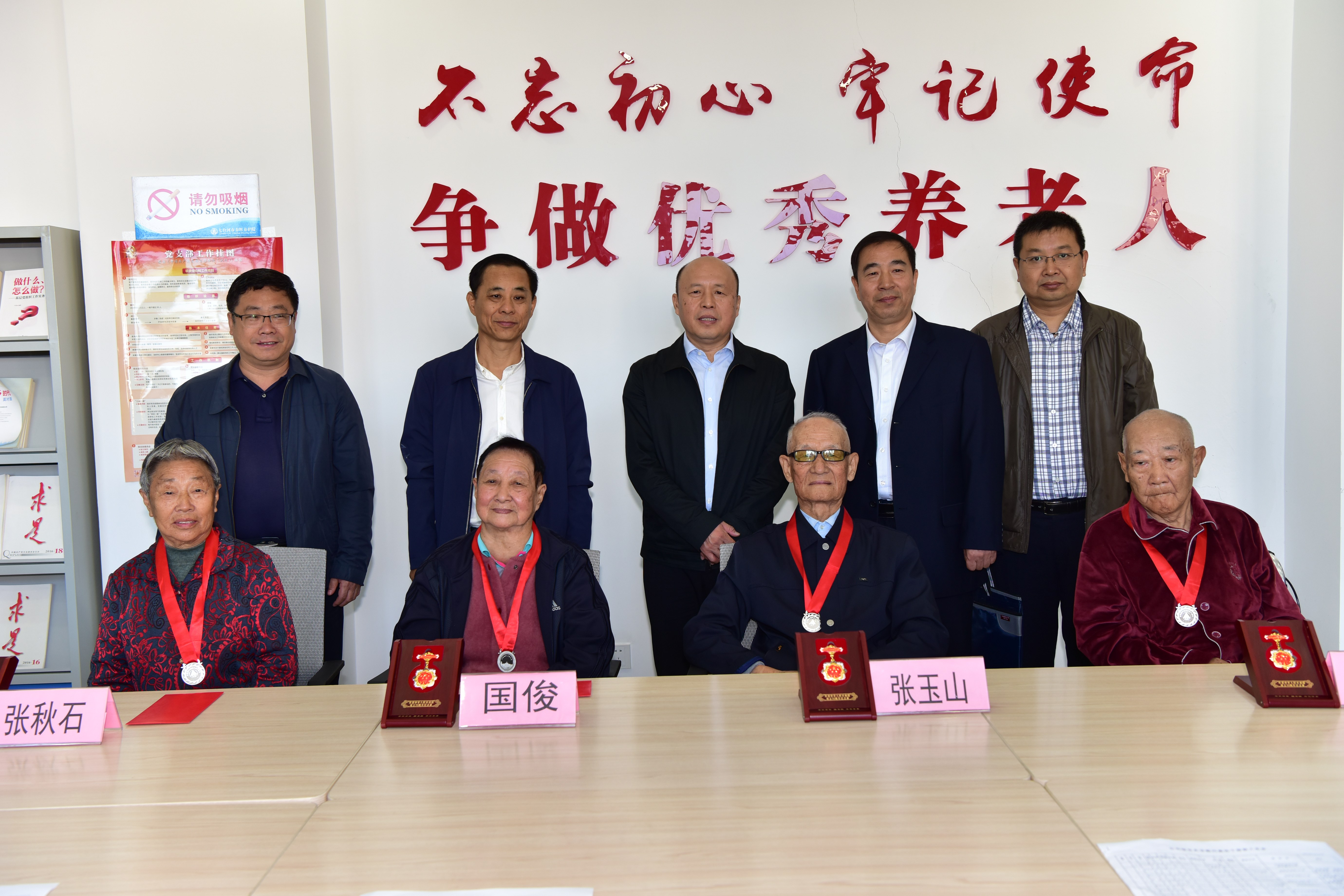 張長山等領導還深入春暉養老院看望慰問了孟憲章、張玉山、國俊、張秋石,為他們送去了節日的祝福和組織的關懷,對他們為國家建設和企業發展做出的貢獻給予高度評價,為他們頒發發“慶祝中華人民共和國成立七十周年紀念章”和七臺河公司頒發的礦區開拓者銀質獎章、礦區開拓者獎金,叮囑他們要保重身體,祝愿他們晚年幸福美滿。