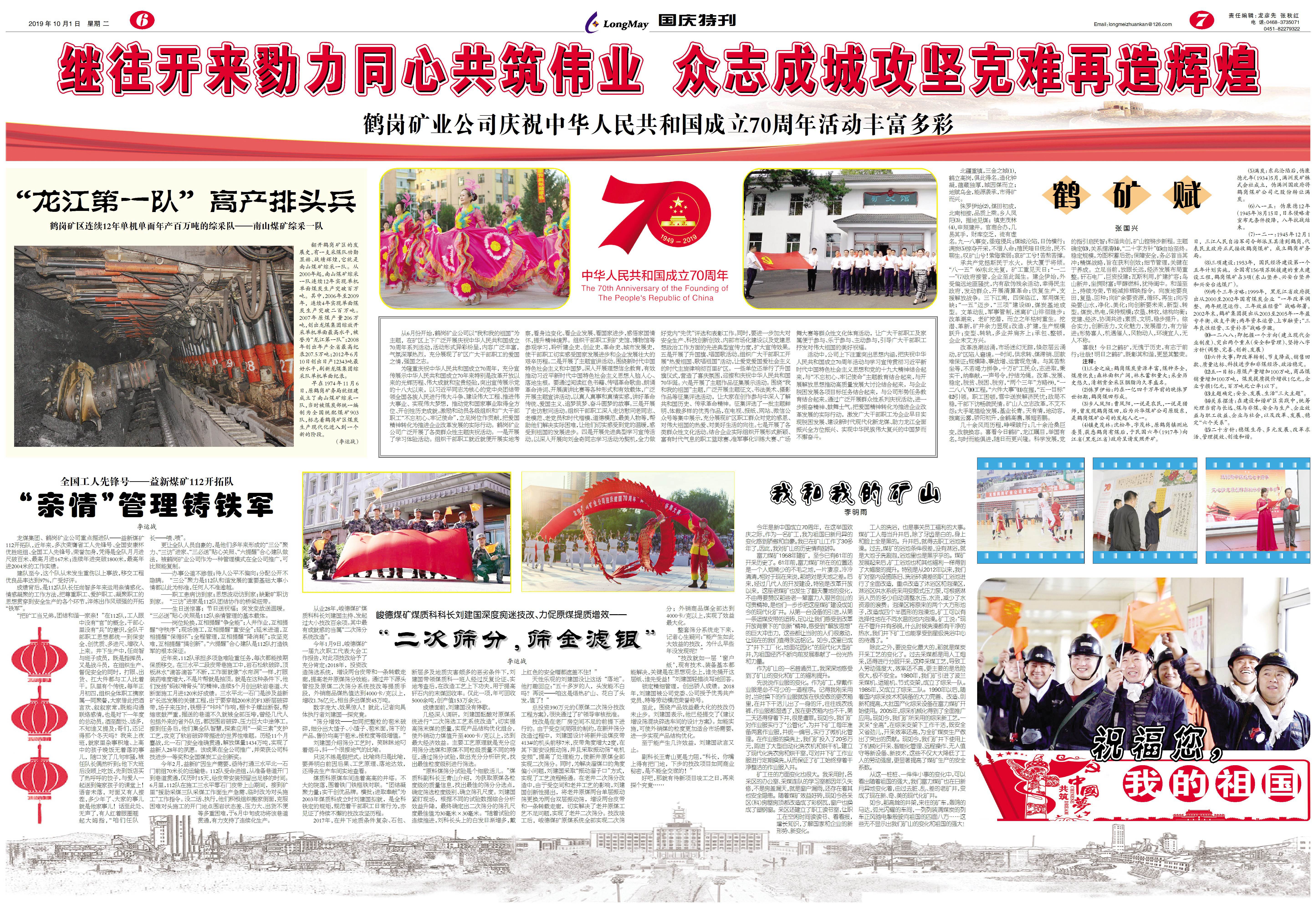 為隆重慶祝中華人民共和國成立70周年,充分宣傳展示中華人民共和國成立70年來特別是改革開放以來的光輝歷程、偉大成就和寶貴經驗,突出宣傳展示黨的十八大以來,以習近平同志為核心的黨中央團結帶領全國各族人民進行偉大斗爭、建設偉大工程、推進偉大事業、實現偉大夢想,推動黨和國家事業取得全方位、開創性歷史成就。激勵和動員各級組織和廣大干部職工“不忘初心、牢記使命”,立足崗位作貢獻,把愛國精神轉化為推進企業改革發展的實際行動。鶴崗礦業公司廣泛開展了各類群眾性主題慶祝活動。一是開展了學習體驗活動。組織干部職工就近就便開展實地考察,看身邊變化、看企業發展、看國家進步,感悟家國情懷,提升精神境界。組織干部職工到礦史館、博物館等參觀學習,聆聽建企史、創業史、革命史、城市發展史,使干部職工切實感受國家發展進步和企業發展壯大的艱辛歷程。二是開展了主題宣講活動。圍繞新時代中國特色社會主義和中國夢,深入開展理想信念教育,有效推動習近平新時代中國特色社會主義思想入腦入心、落地生根。要通過閱讀紅色書籍、傳唱革命歌曲、朗誦革命詩詞、開展演講比賽等各種形式和有效載體,廣泛開展主題宣講活動,以真人真事和真情實感,講好革命傳統、愛國主義、追夢筑夢、奮斗圓夢的故事。三是開展了走訪慰問活動。組織干部職工深入走訪慰問老同志、老模范、老黨員和時代楷模、道德模范、最美人物等,幫助他們解決實際困難,讓他們切實感受到黨的溫暖,感受到祖國的發展進步。四是開展先進典型學習宣傳活動。以深入開展向劉金奇同志學習活動為契機,全力做好黨內“先優”評選和表彰工作。同時,要進一步加大對安全生產、科技創新創效、內部市場化建設以及黨建思想政治工作方面的先進典型宣傳力度,擴大宣傳效果。五是開展了升國旗、唱國歌活動。組織廣大干部職工開展“熱愛祖國、歌唱祖國”活動,讓愛黨愛國愛社會主義的時代主旋律響徹百里礦區。一些單位還舉行了升國旗儀式,營造了喜慶氛圍,迎接和慶祝中華人民共和國70華誕。六是開展了主題作品征集展示活動。圍繞“我和我的祖國”主題,廣泛開展主題征文、書法美術、攝影作品等征集評選活動,讓大家在創作參與中深入了解共和國歷史、傳承革命精神。征集評選了一批主題鮮明、體裁多樣的優秀作品,在電視、報紙、網站、微信公眾號等集中展示,充分展現礦區職工群眾對黨的感恩、對偉大祖國的熱愛、對美好生活的向往。七是開展了各類群眾性文化活動。結合企業實際組織開展形式新穎、富有時代氣息的職工籃球賽、準軍事化訓練大賽、廣場舞大賽等群眾性文化體育活動,讓廣大干部職工及家屬便于參與、樂于參與、主動參與,引導廣大干部職工抒發對偉大祖國的美好祝福。