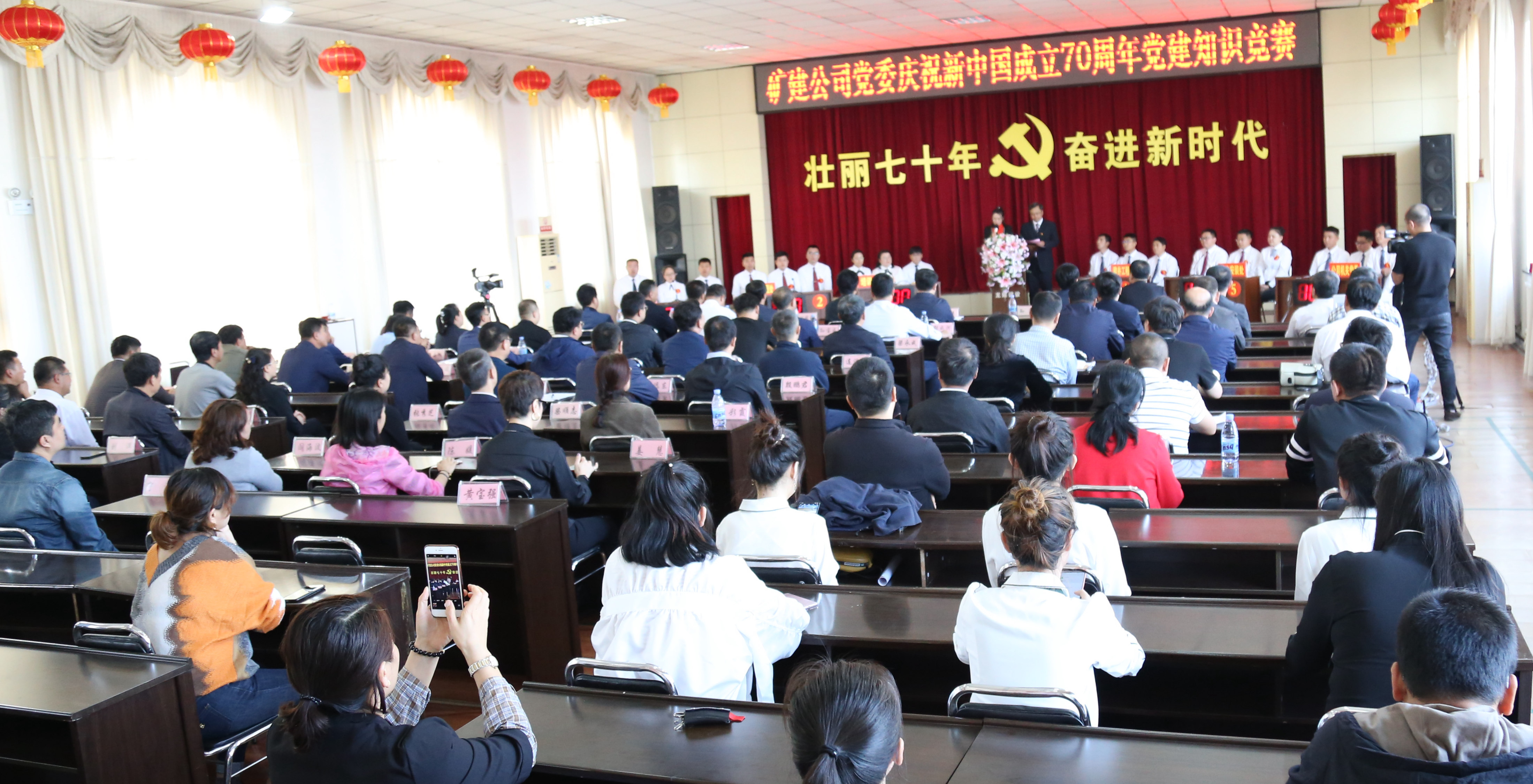 這是9月27日下午,在喜迎新中國成立70周年之際,為謳歌偉大祖國取得的輝煌成就,激發全公司干部職工的愛國熱情,展現礦建人改革創新、勇于擔當的時代精神,礦山建設公司舉辦的慶祝新中國成立70周年主題黨建知識競賽的答題現場。