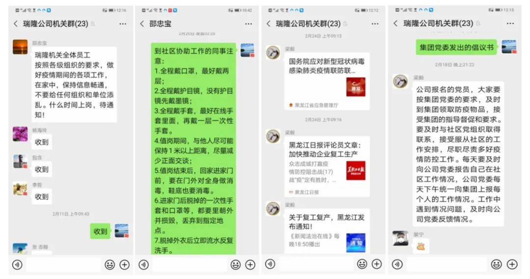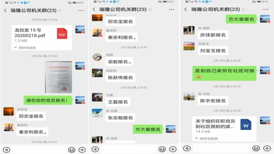 2月18日晚,集團公司黨委號召全體在哈黨員下沉社區協助抗擊疫情通知發出后,瑞隆公司黨委立即通過微信和電話向公司機關全體黨員發出總動員,五名班子成員全部報名參戰,拉開了“班子帶頭下社區,同戰疫情渡難關”的序幕。