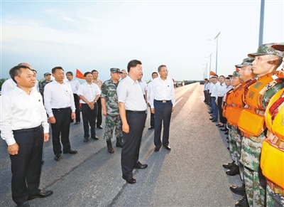大堤上,習近平親切看望慰問了在防汛抗洪救災斗爭中犧牲同志的家屬、防汛抗洪一線人員、先進典型代表和參加抗洪搶險的部隊官兵,并向全國奮戰在防汛抗洪救災一線的同志們表示誠摯的問候。他強調,今年入汛以來,南北方江河湖泊接連出現超警戒水位險情。廣大干部群眾和人民解放軍、武警官兵堅決響應黨和政府號召,發揚不怕累苦、不怕疲勞、不怕犧牲的精神斗志,堅守在防汛抗洪救災第一線,涌現了許多先進典型和感人事跡,展現了中國人民眾志成城、頑強拼搏、敢于勝利的英雄氣概,書寫了洪水無情人有情的人間大愛。黨和人民感謝你們!