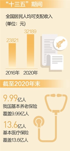 “十三五”期間,我國民生保障力度不斷加大。基本養(yǎng)老金連續(xù)多年調(diào)整,退休人員獲得感、幸福感、安全感持續(xù)增強。截至2020年末,我國基本養(yǎng)老保險覆蓋9.99億人,基本醫(yī)療保險覆蓋13.6億人,織成了一張世界最大的社會保障網(wǎng)。