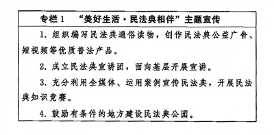 廣泛開展民法典普法工作,闡釋好民法典中國特色社會主義的特質,闡釋好民法典關于民事活動平等、自愿、公平、誠信等基本原則,闡釋好民法典關于堅持主體平等、保護財產權利、便利交易流轉、維護人格尊嚴、促進家庭和諧、追究侵權責任等基本要求,闡釋好民法典一系列新規定新概念新精神。推動各級黨和國家機關帶頭學習宣傳民法典,推動領導干部做學習、遵守、維護民法典的表率,提高運用民法典維護人民權益、化解矛盾糾紛、促進社會和諧穩定的能力和水平。把民法典納入國民教育體系,加強對青少年民法典教育。以“美好生活·民法典相伴”為主題,組織開展民法典主題宣傳,讓民法典走到群眾身邊、走進群眾心里。