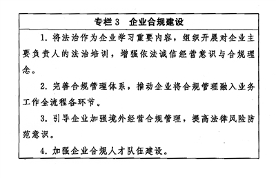 深化依法治企。深化“法律進企業”,落實經營管理人員學法用法制度。加強企業法治文化建設,提高經營管理人員依法經營、依法管理能力。推動企業合規建設,防范法律風險,提升企業管理法治化水平。