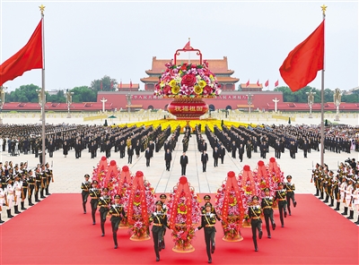 敬獻(xiàn)花籃儀式由中共中央政治局委員、北京市委書記蔡奇主持。