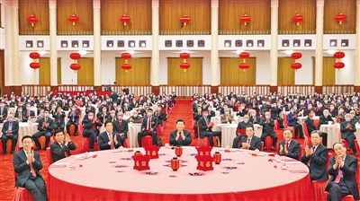 人民大會堂宴會廳張燈結彩、喜氣洋洋,各界人士歡聚一堂、共迎佳節,現場洋溢著喜慶祥和的節日氣氛。