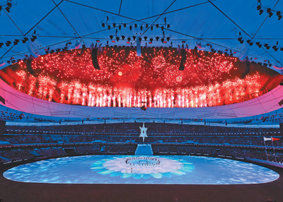 場地中央,燦爛的星海中,浮現過往12屆冬殘奧會舉辦城市名稱,最終定格在“2022北京”。代表冬殘奧會六大競賽項目的運動員們從一條雪道疾馳而下,滑入場內。場地中央出現一條冰壺賽道,隨著冰壺滑出,倒計時數字在場地內閃現:10、9、8、7、6、5、4、3、2、1……全場歡呼。