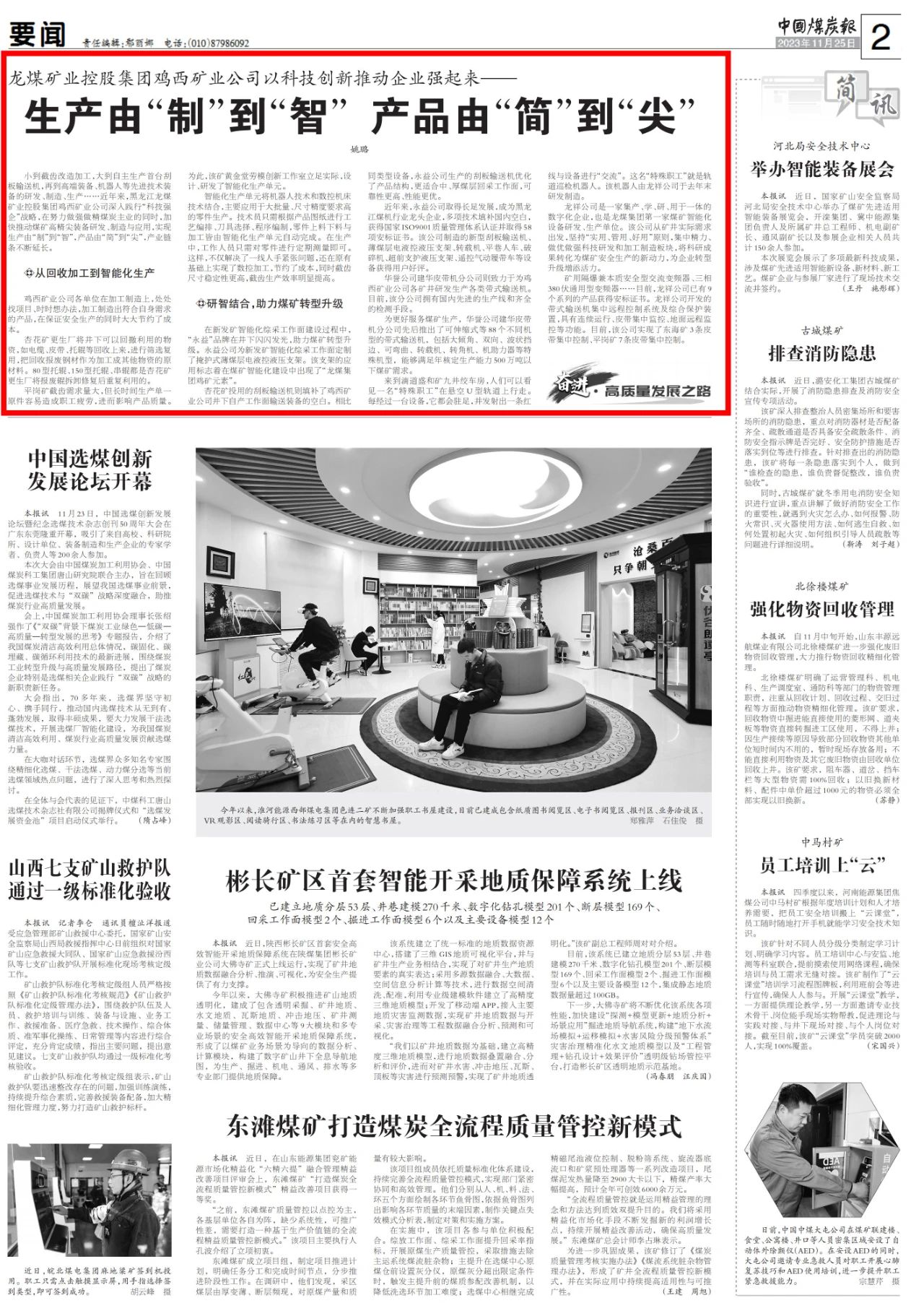 11月25日,《中國煤炭報》對雞西礦業公司推動煤礦高精尖裝備研發制造與應用進行報道。