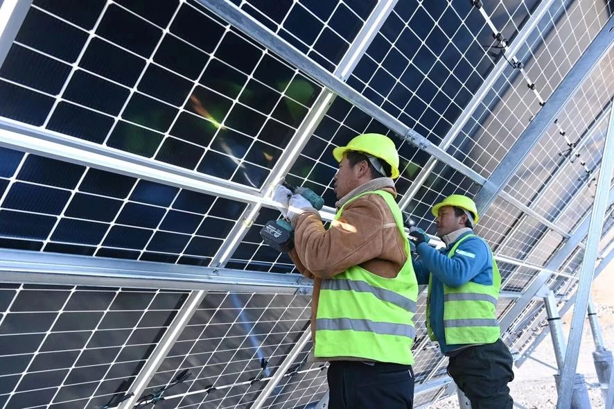 遠遠望去,一片深藍色的海洋映入眼簾。近看,一排排光伏板在皚皚白雪映射下,呈現出另一番自然生態美景。
