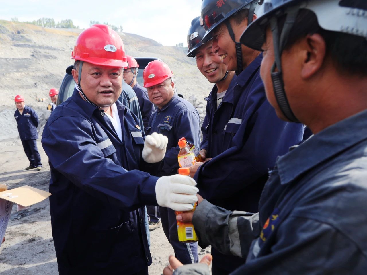 在新嶺礦生產作業現場,王戈代表集團公司黨委、集團公司向高溫天氣堅持生產的一線職工表示慰問,并將解暑降溫飲品送到職工手中,叮囑他們要加強自主保安,按規作業,確保安全生產。
