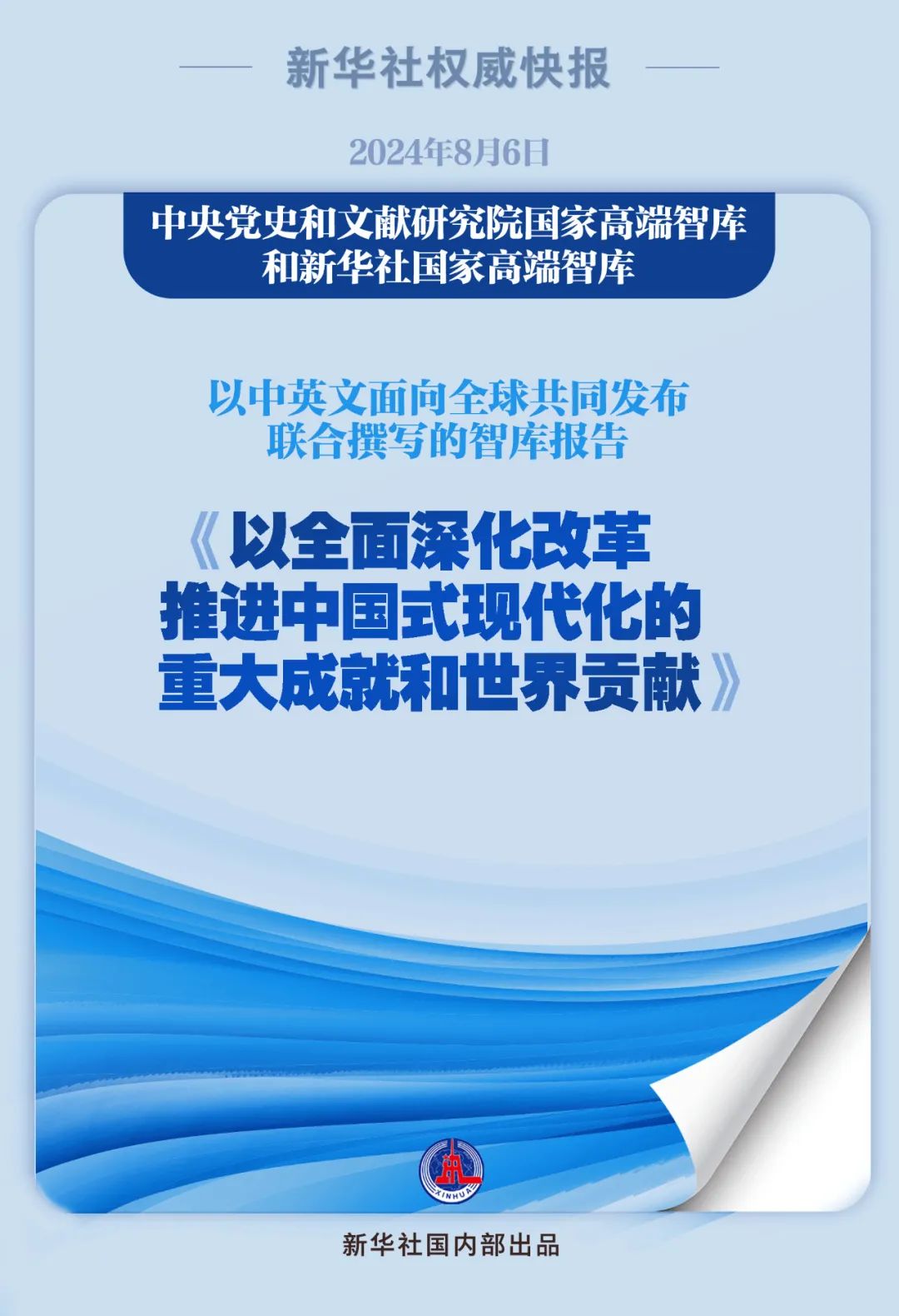 “紅廳論壇:讀懂中國共產黨二十屆三中全會”主題研討會8月6日在中國共產黨歷史展覽館紅色大廳舉行。會上,中央黨史和文獻研究院國家高端智庫和新華社國家高端智庫以中英文面向全球共同發布聯合撰寫的智庫報告《以全面深化改革推進中國式現代化的重大成就和世界貢獻》。