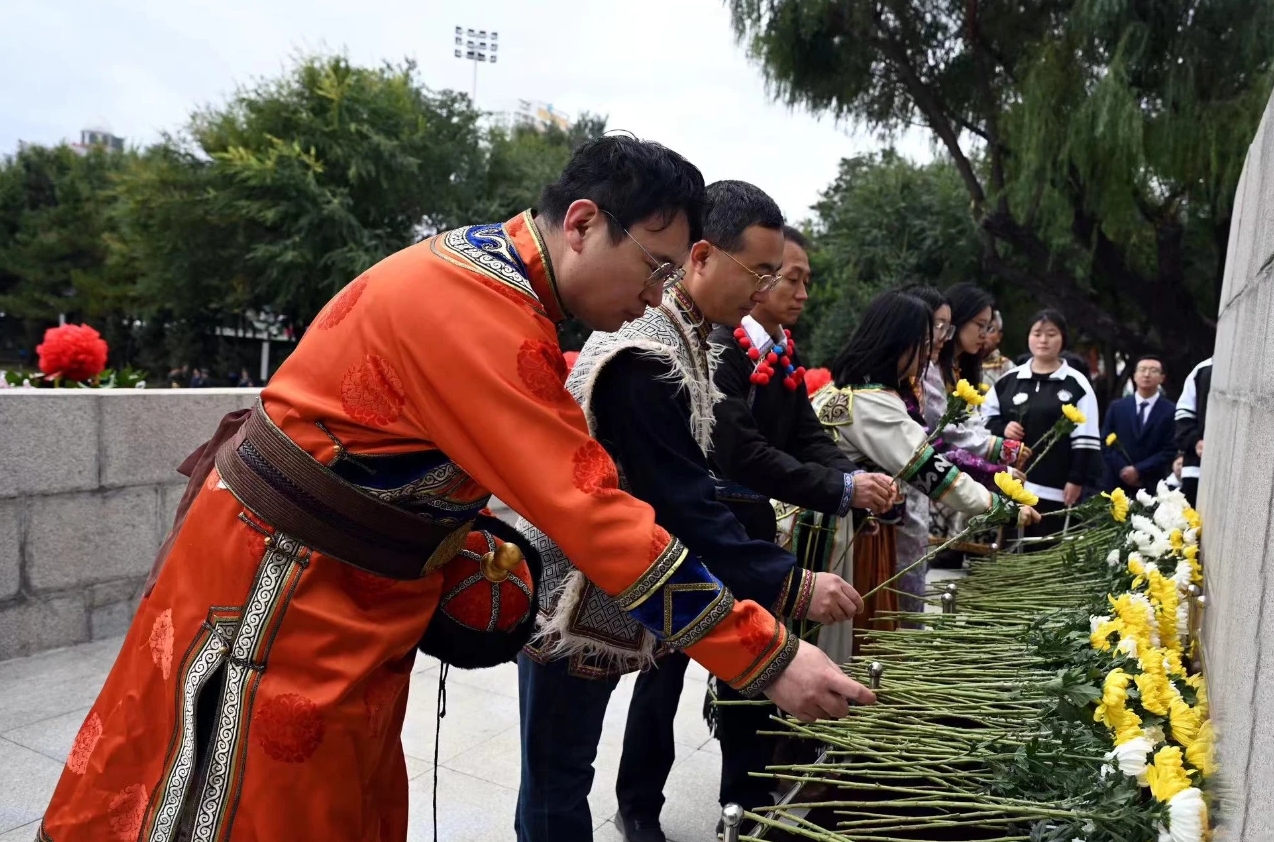 省及哈爾濱市各界代表向烈士紀(jì)念塔敬獻(xiàn)鮮花。